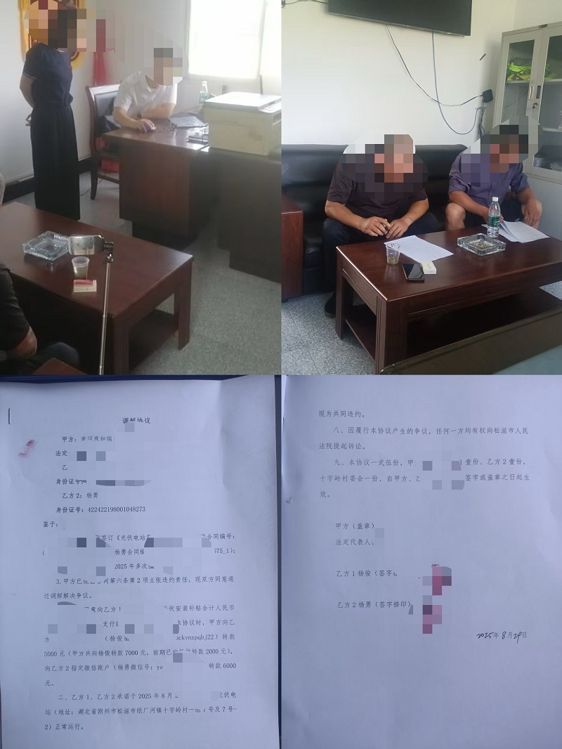 近日,松滋市纸厂河镇十字岭村居民杨某因房屋光伏安装问题与光伏老板万某产生纠纷,一度关停发电设备。经该镇平安建设办与村委会联合调 ...