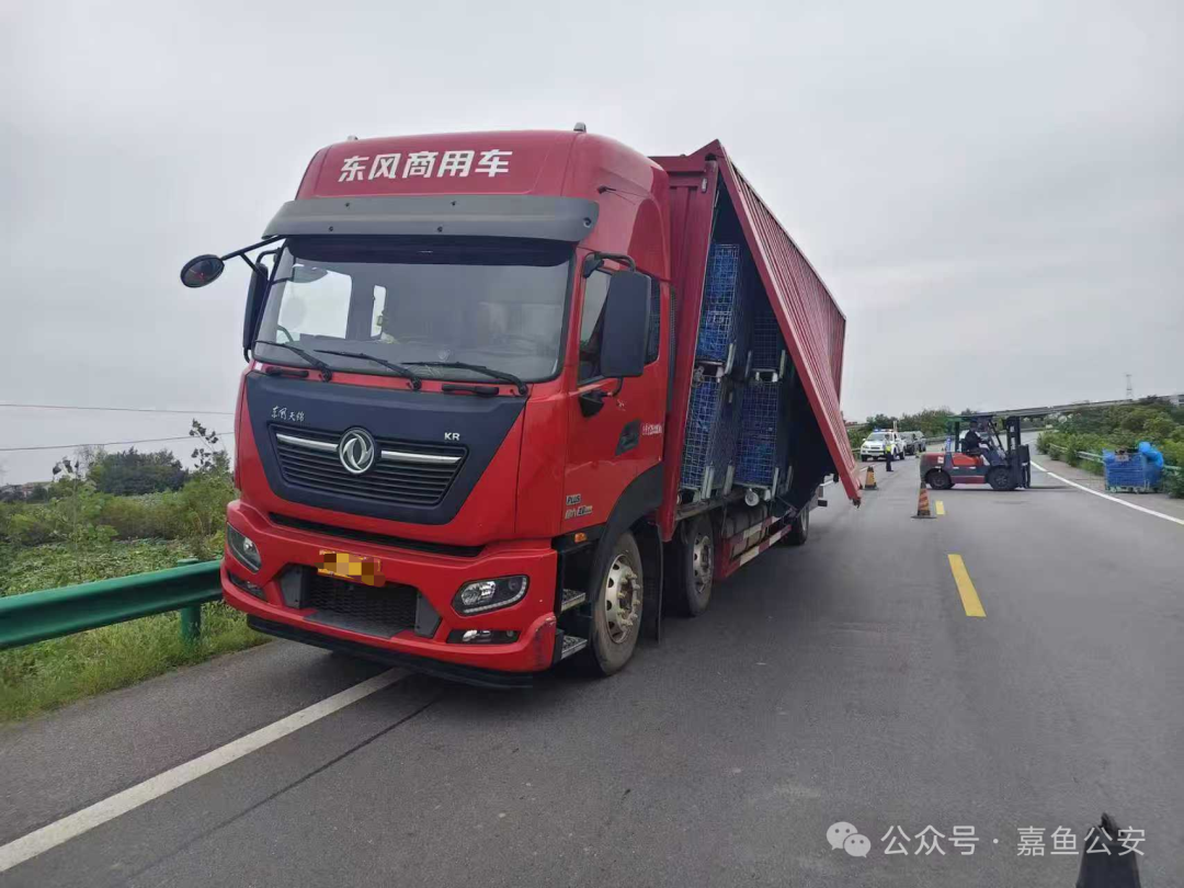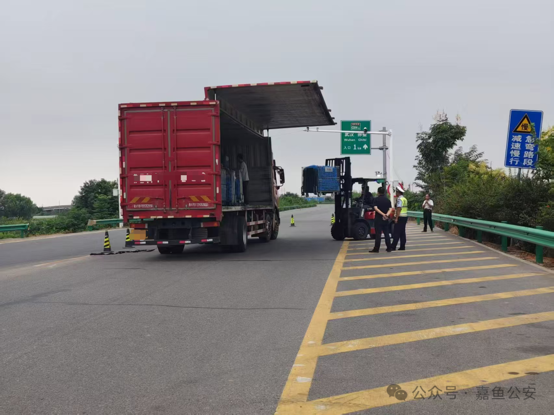 抵达事故地点后,民辅警发现:一辆重型厢式货车因货物固定轮损坏导致货物往左侧偏移摇摇欲坠,车辆向左倾斜,随时可能侧翻。更危急的是,该路段地处高速连接线的大弯道、过往重型货车密集,且已超出中队辖区范围。为杜绝次生事故,民辅警第一时间用反光锥桶和警车封控半幅路面,保障道路通行安全;隐患排除后,又与企业工作人员携手,对货车货物进行卸装转运。经过三个多小时的同心协作,险情最终被安全、及时化解。