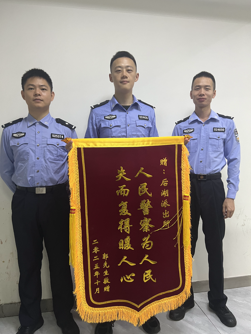 查明案情后,办案民警对徐某耐心地进行普法教育,徐某当场表示悔过,主动退赔了郭先生的全部经济损失。案件侦破当晚,郭先生连夜定制一面写有“人民警察为人民,失而复得暖人心”的锦旗送至后湖所,向办案民警表达感激之情。