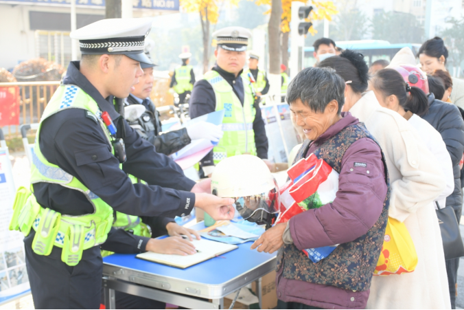 在民主路老广场宣传点,活动现场人头攒动、氛围热烈。民警与志愿者们通过“提问抢答”的互动模式,围绕交通法规、“一盔一带”、酒驾醉驾危害等核心知识点展开问答,市民踊跃参与、积极应答,在轻松氛围中夯实安全认知。现场同步发放交通安全宣传单5000余份,赠送安全头盔300余顶,以及印有“文明交通,礼行天下”主题的定制小礼袋、实用茶杯等纪念品,将安全理念与暖心关怀精准传递。事故案例展板前,民警结合本地典型事故案例,用通俗易懂的语言剖析不戴头盔、闯红灯、违法载人等行为的严重后果,直观的画面与深刻的警示让围观群众深受触动,纷纷表示将自觉摒弃交通陋习。