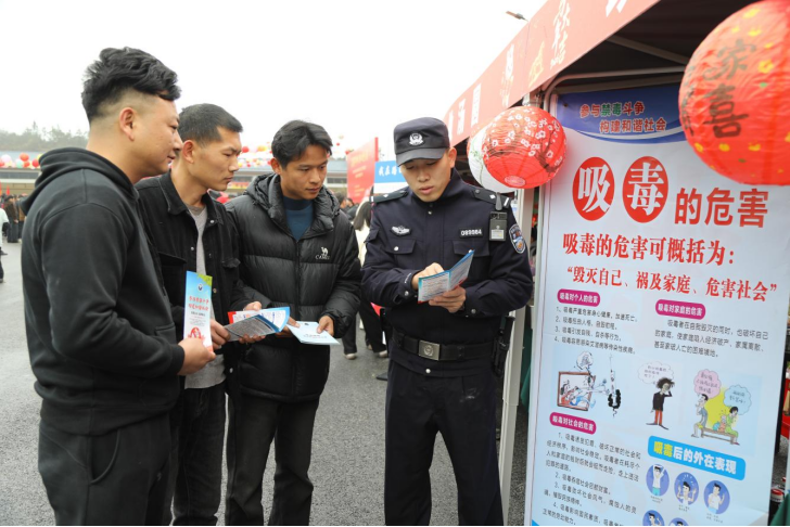 活动现场人头攒动、年味十足,农特产品、非遗手作、特色美食琳琅满目,往来群众络绎不绝,处处洋溢着喜庆祥和的节日氛围。民辅警抢抓人流密集契机,在集市核心区域设立宣传服务点,摆放禁毒、反诈宣传展板,用通俗易懂的语言,向过往群众普及安全知识。