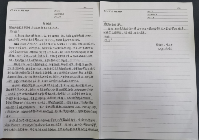 “感谢葛纯度警官不畏困难、持之以恒,他的专业与高效,给了我们极大帮助。”为表感激,张女士写下感谢信,向民辅警致以诚挚敬意。