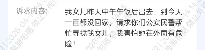 “我女儿昨天中午午饭后出去,到今天一直都没回家,请求你们公安民警帮忙寻找,我害怕她在外面有危险!”4月13日20时许,一通满是焦急与恐慌的求助,通过“宁好码”平台传到通城县公安局麦市派出所,辖区居民葛先生看着迟迟未归的女儿,心急如焚。