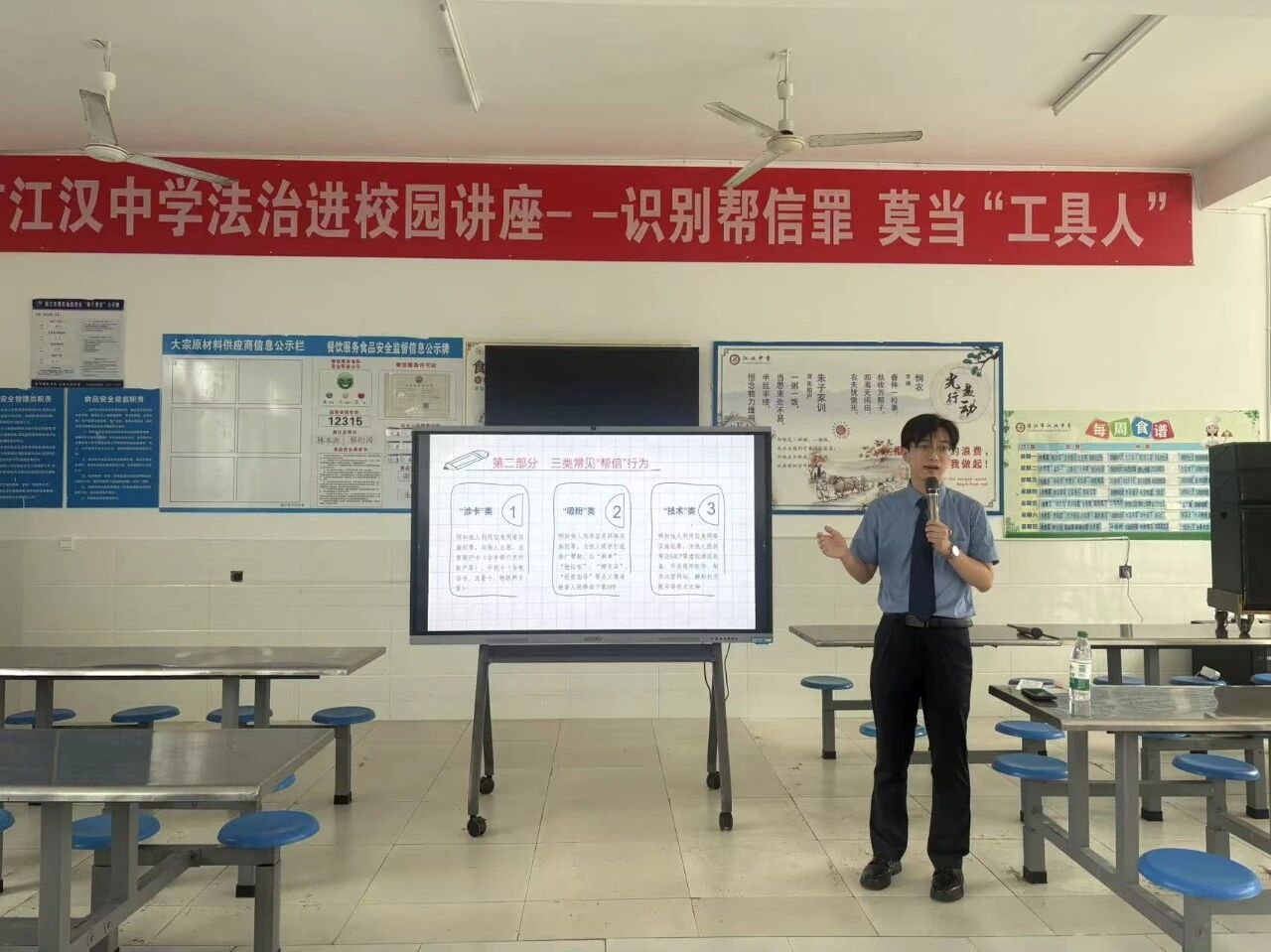 ▲ 法治宣讲员蒋文涵在潜江市江汉中学讲授《识别帮信罪 莫当“工具人”》