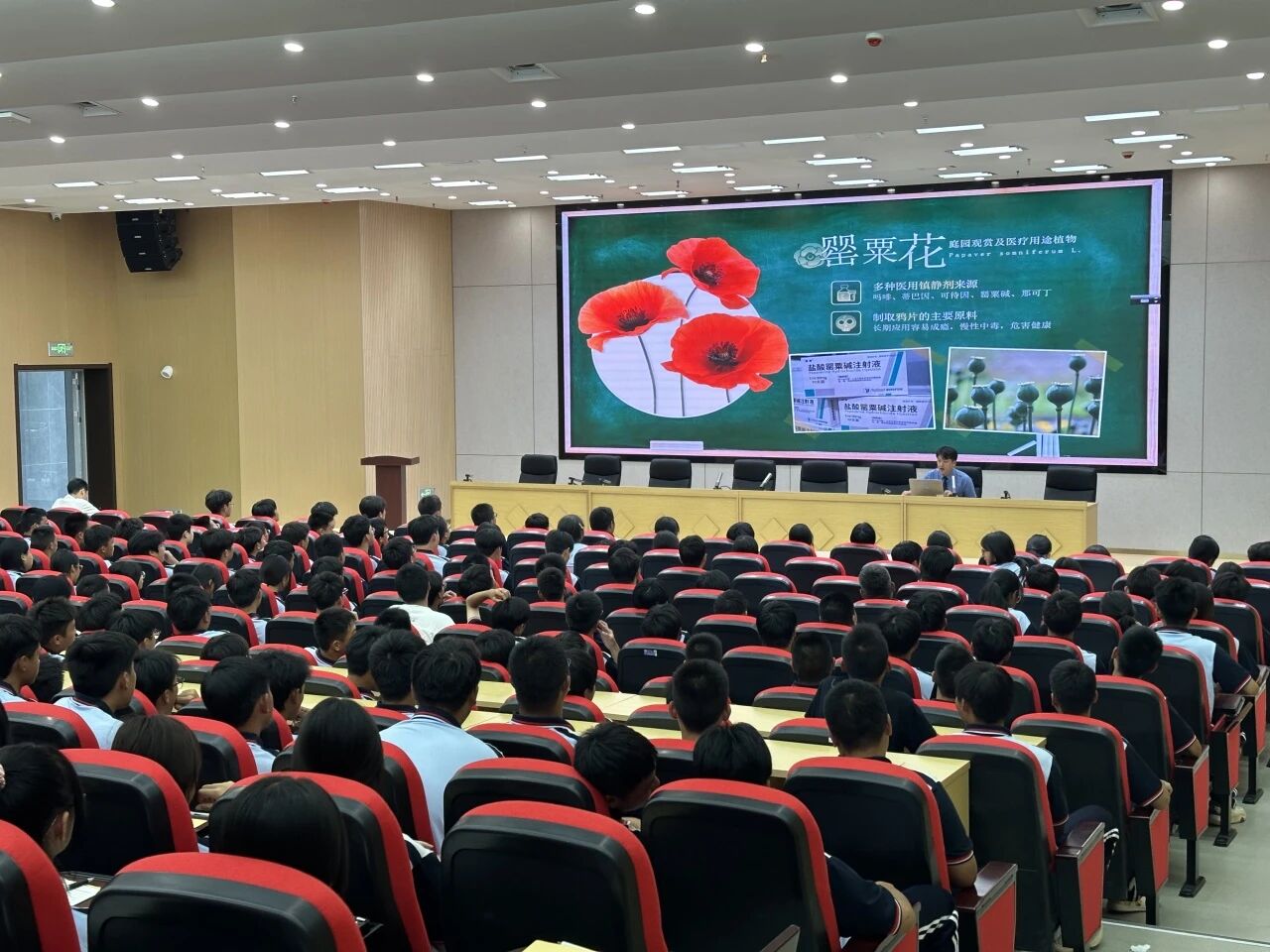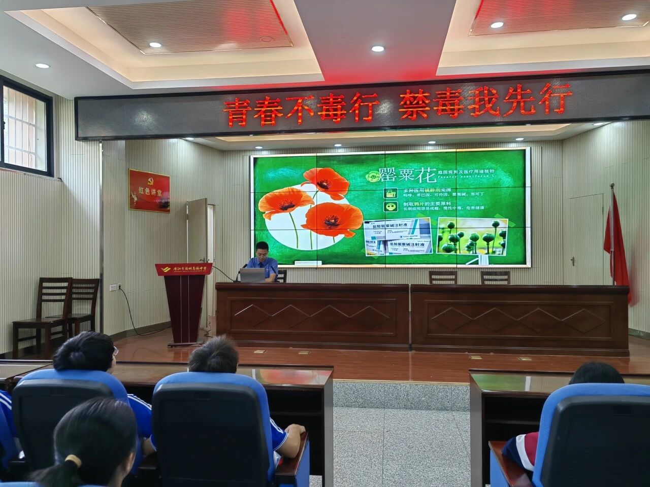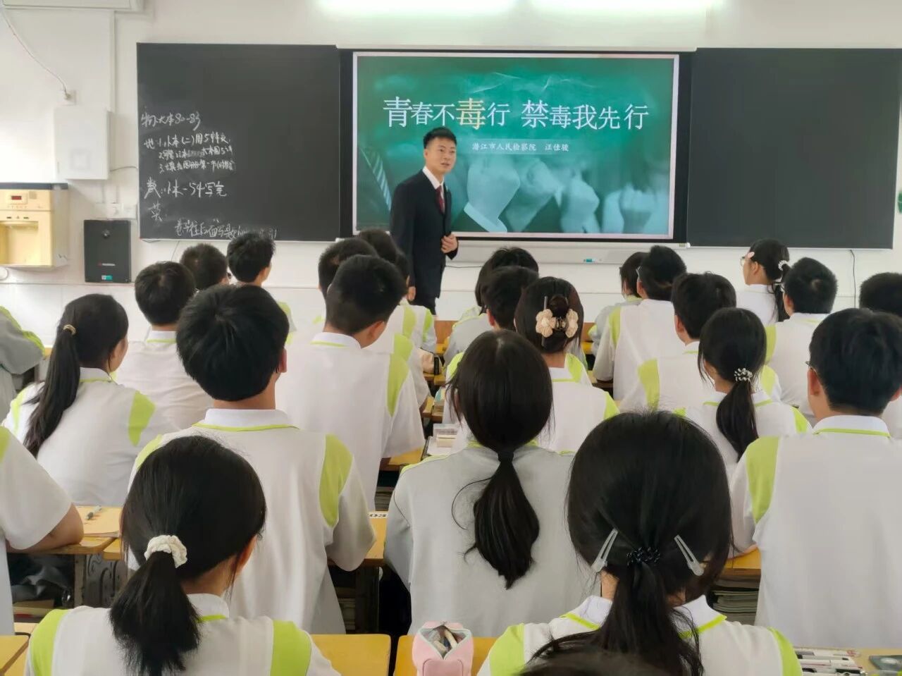 ▲法治宣讲员汪佳骏在潜江市章华高中讲授《青春不“毒”行 禁毒我先行》