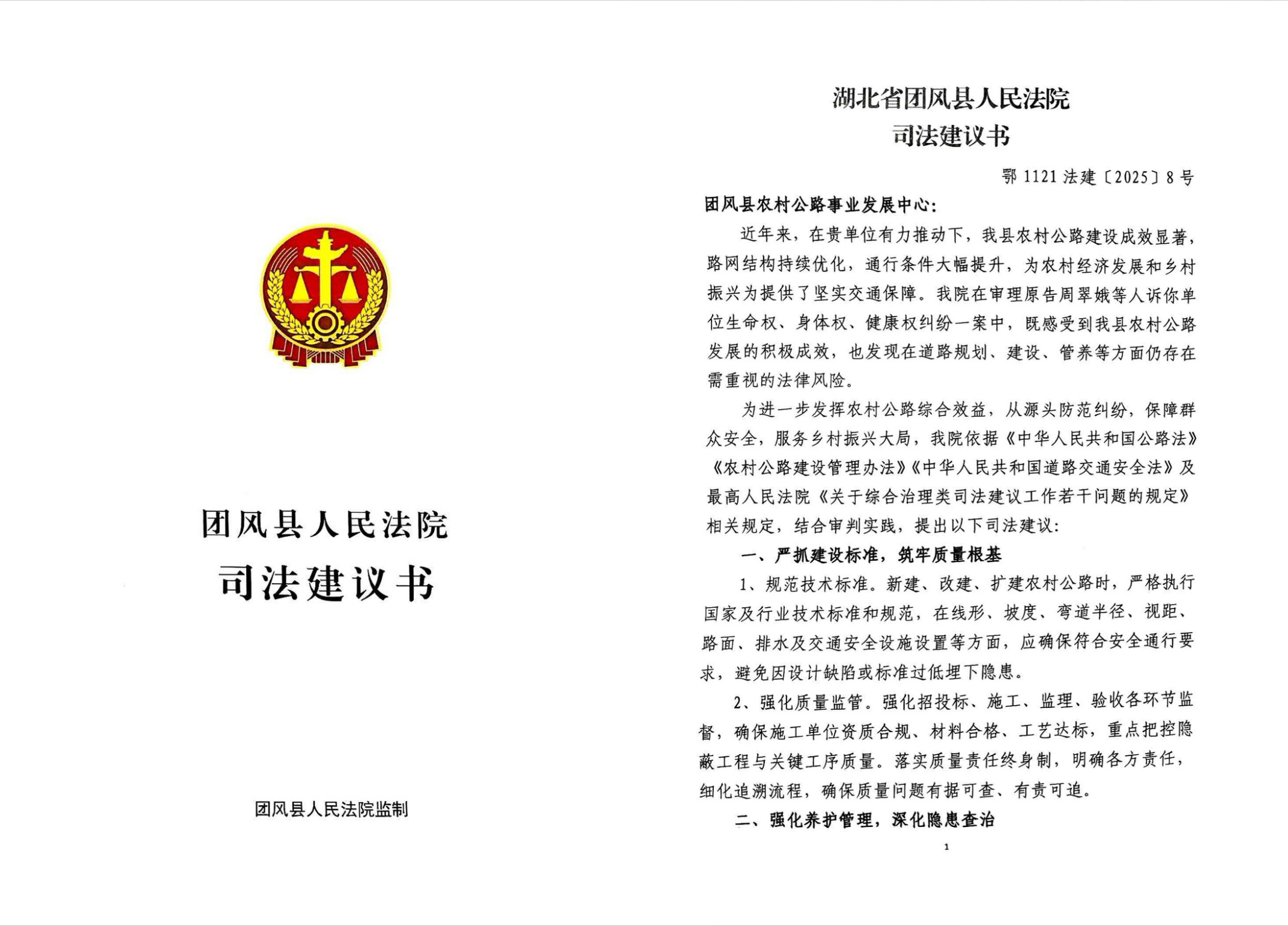 团风县人民法院在审理涉及农村公路安全的相关案件时发现,尽管全县农村公路建设成效显著,但在管理、养护、使用及路域环境治理等方面仍存在潜在的法律风险和安全隐患。为从源头上预防和减少矛盾纠纷,保障人民群众生命财产安全,服务乡村振兴战略大局,团风县人民法院依据《中华人民共和国公路法》《农村公路建设管理办法》《中华人民共和国道路交通安全法》等相关规定,结合审判实践,向两个与农村公路工作密切相关的单位发出了具有针对性的司法建议。