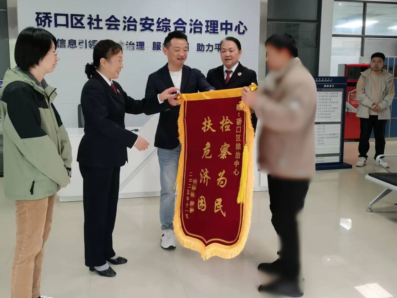 11月5日上午,武汉市硚口区综治中心迎来了温暖的一幕:一名中年男子满怀感激之情,将一面绣着“检察为民 扶危济困”的锦旗郑重地送到这里。区委政法委副书记吴铭、区妇联相关部门负责人以及硚口区人民检察院的检察干警们,共同见证了这一温暖时刻。
