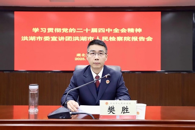 樊胜以《深学笃行党的二十届四中全会精神在谱写中国式现代化湖北实践洪湖篇章中彰显检察担当》为题,从五个方面宣讲学习党的二十届四中全会精神的认识和感悟。