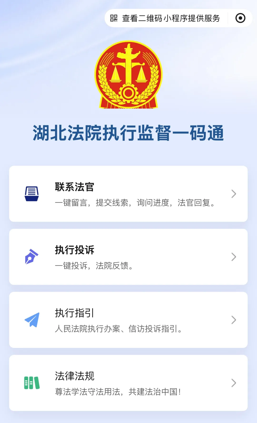 “一码通”将执行服务与监督功能整合于指尖,扫码即用、操作简单、反馈及时。欢迎您体验使用,共同推动执行工作更加规范、透明、高效。