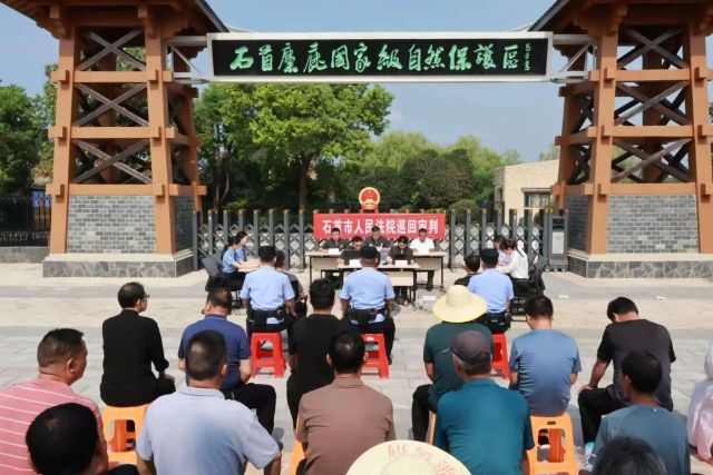 “这张图片是我院联合市法院在保护区内组织开展的一次特殊庭审,庭审效果特别好,参加活动的群众都深受触动,纷纷表示要做野生动物和生态环境保护的践行者和倡导者。”检察干警指着一张图片介绍。图片上,石首麋鹿国家级自然保护区的牌匾的与庄严的国徽交相辉映,不少群众正在现场旁听庭审。