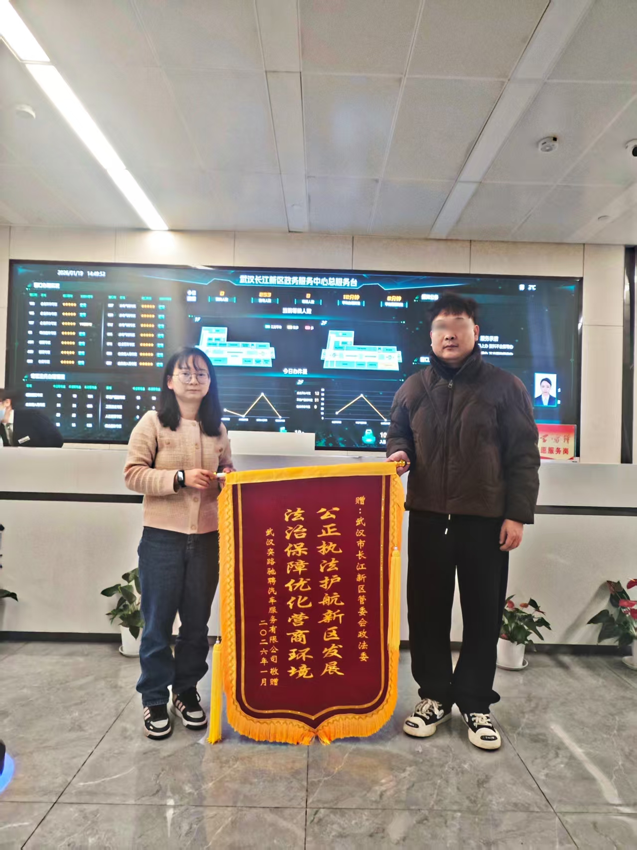 图1 阮先生向长江新区党工委政法委赠送锦旗表示感谢