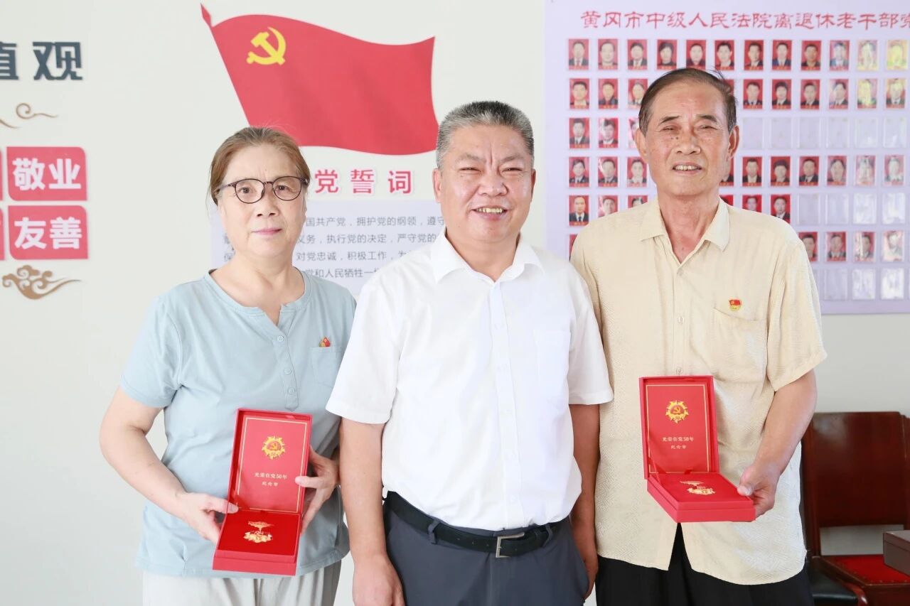 活动伊始,吕子雄为老党员王景莲、王广球颁发“光荣在党50年”纪念章,传递党组织对老同志数十年来忠诚与奉献的崇高敬意。两位老同志表示将永葆党员本色,继续为黄冈中院高质量发展贡献“银发智慧”。