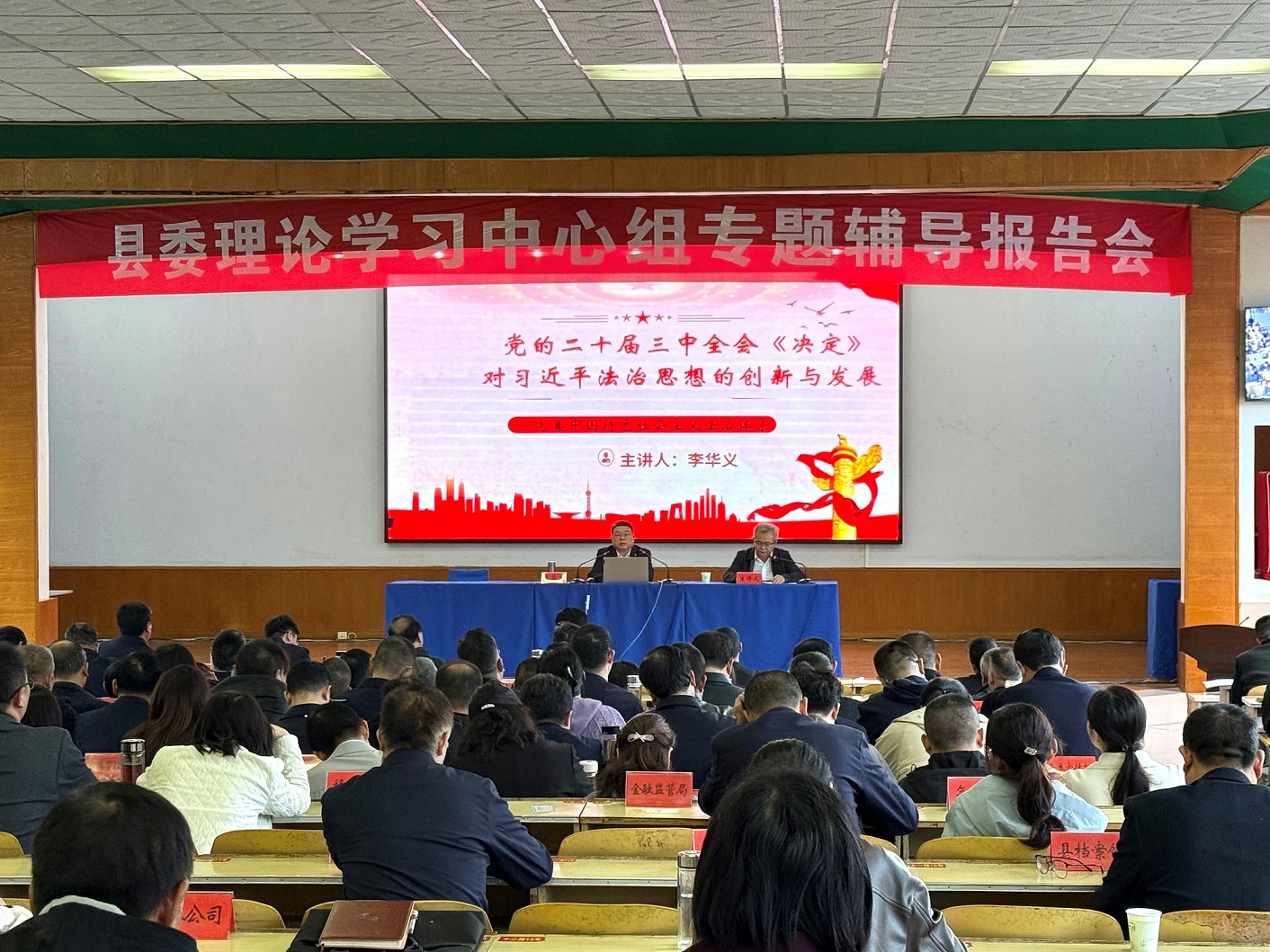 报告会上,李华义以《党的二十届三中全会〈决定〉对习近平法治思想的创新与发展》为题,从“深入认识完善中国特色社会主义法治体系的重大意义”、“认真总结中国特色社会主义法治体系建设的伟大成效”、“准确把握完善中国特色社会主义法治体系的正确方向”、“全面落实完善中国特色社会主义法治体系的重点任务”等四个方面作了详细解读。讲座立意高远、主题鲜明、视野宏阔、逻辑严谨、内容丰富、脉络清晰,既有理论高度,又有实践深度,具有很强的政治性、思想性、理论性、指导性和可操作性,为进一步学习领会习近平法治思想和深入推进法治南漳、法治政府、法治社会建设厘清了思路、明晰了方向、传授了方法。
