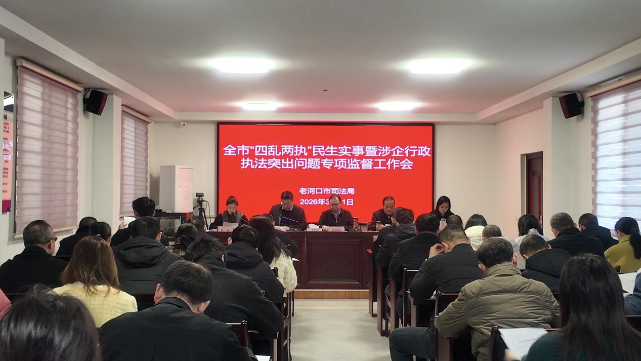 3月11日,老河口市“四乱两执”民生实事暨涉企行政执法突出问题专项监督工作会在市司法局一楼会议室召开。市政府副市长黄伟森出席会议并讲话,市政府四级调研员叶宗柏主持会议,市纪委常委、监委委员张丽参会督导。全市各行政执法部门分管负责同志及具体科室负责人、市司法局工作专班全体成员参加会议。