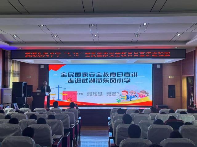 为深入贯彻落实总体国家安全观,增强青少年国家安全意识和法治素养,4月15日,在第十一个全民国家安全教育日来临之际,长江新区司法局武湖司法所联合武湖街团工委、武湖人民法庭共同走进武湖街东风小学,带来一场主题鲜明、内容生动、互动深入的“国家安全进校园”专题教育活动,以专业的法律素养和贴近学生的讲述方式,为师生们带来了一堂深刻而又鲜活的国家安全主题教育课,在春日校园里播撒下守护国家安全的法治种子,让国家安全观念在校园落地生根。