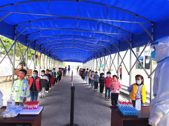 15日上午8:30,在夏梁琴副校长的统一调度下,全校师生员工分组、分年级进行核酸检测。所有工作人员密切配合,班主任带队,科任老师登记和维持纪律、医护人员采集咽试子、各年级蹲点领导监管。学生们10人一组、间隔1米,在老师们的清晰指引下,有条不紊地按照班别、小组依次进行核算检测。医务人员专业认真,学生彬彬有礼,分管领导考虑周全,整个过程井然有序。