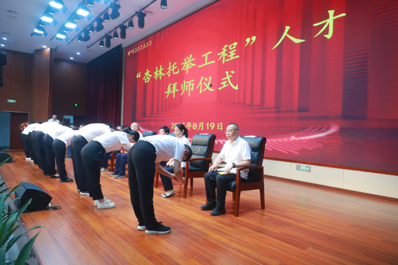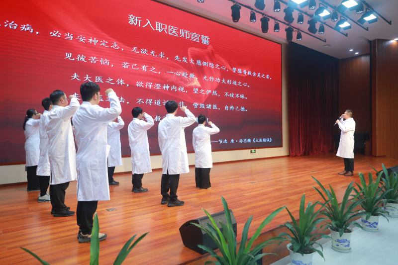 副院长张朝驹主持杏林托举人才拜师仪式,青年医师向导师行拜师礼,寓意中医药学术薪火相传。新入职医师在副院长李睿舒的带领下庄严宣誓,诵读《大医精诚》节选誓词,展现传承中医药文化的决心。