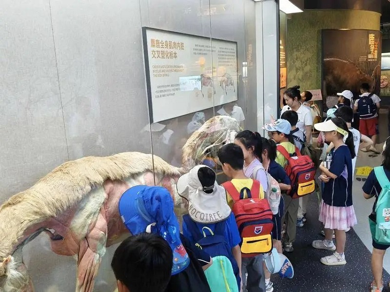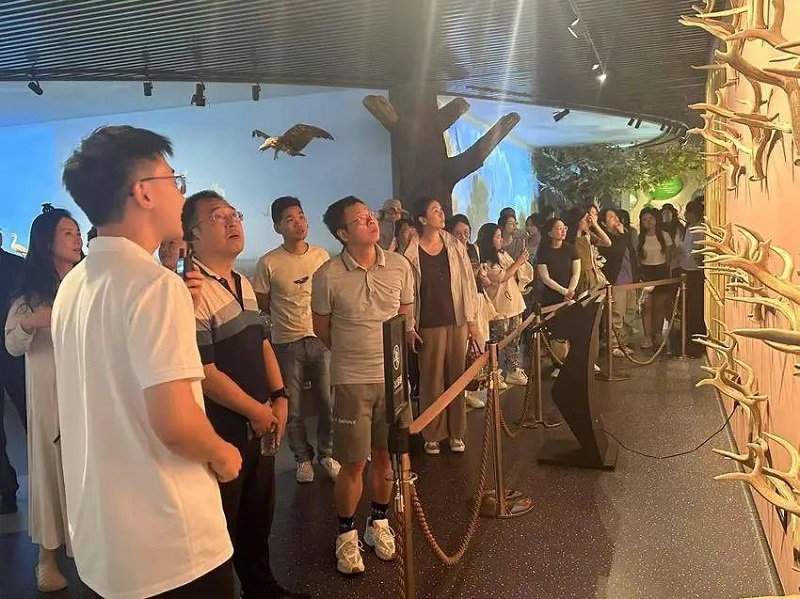 2000平方米的麋鹿科普馆同样是“人气打卡点”。馆内设置“东方神鹿”“九曲荆江”“守护麋鹿”等五大主题展区,通过立体标本、图文展板、互动沙盘、多媒体影片及沉浸式体验装置,全方位呈现麋鹿的进化历程和石首数十年间从“拯救麋鹿”到“繁衍生息”的保护故事。游客在参观中既能解锁生态知识,也能深刻感受当地生态保护的坚定决心与显著成效。来自公安县章田寺镇的游客张英权,正是被石首的生态口碑所吸引才专程过来。