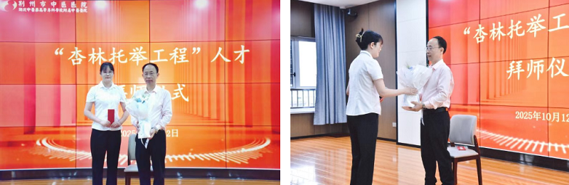 作为本次活动的重要环节,“杏林托举”人才培养工作拜师仪式在庄重而温馨的氛围中举行,荆州市中医医院风湿病科青年医师曾冬敏正式拜师省内知名风湿病专家涂胜豪教授。
