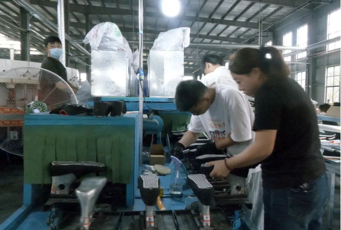 走进湖北军盛制鞋工业有限公司生产车间,一派热火朝天的生产景象。生产线上,操作员将原材料放入生产模具,经过热塑设备加温挤压成型,随后拿到下一道工序进行修整毛边、打包装箱。