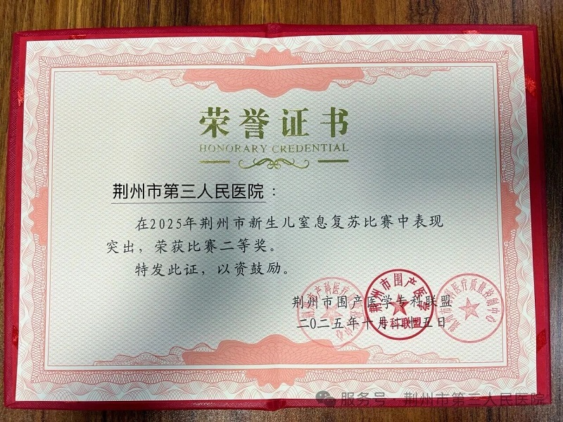 深秋十月,霜降刚过,微风小雨。10月25日,由荆州市围产医学专科联盟主办的“荆州市第三届新生儿复苏技能竞赛”在市中心医院落下帷幕。由荆州市第三人民医院儿科医生杜威、护士吴琦和产科医生郑典雅、护士杨莉组成的四人复苏小组取得了满意的成绩,在八支队伍的激烈角逐中表现优秀,荣获二等奖。