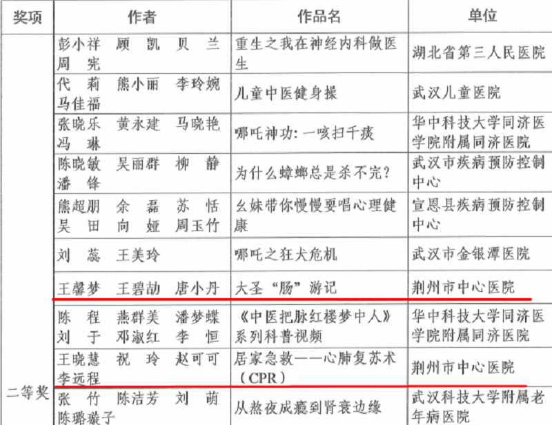 近日,由湖北省科学技术协会主办的2025年湖北省科普短视频大赛圆满落幕,荆州市中心医院两部科普作品凭借创新形式与专业内容,从全省数千部参赛作品中脱颖而出,心血管二病区王晓慧护士长团队创作的《居家急救-心肺复苏(CPR)》,消化内科一病区王馨梦、王碧劼、唐小丹创作的《大圣“肠”游记》均斩获二等奖。