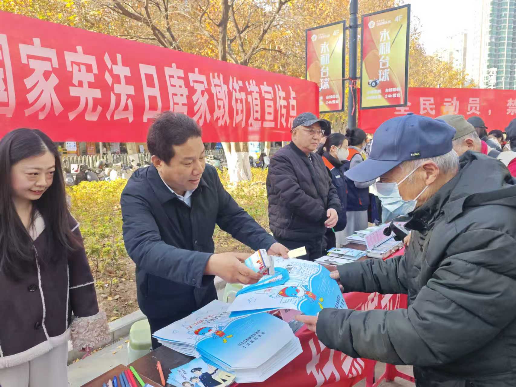 12月3日上午,武汉市江汉区唐家墩街道在菱角湖壹号组织开展国家宪法宣传周集中宣传活动。活动由唐家墩街道牵头,联合区司法局、应急管理局、国动办、统计局、禁毒中心、商务局、市场监督所、医保局、工会、城市运行中心、社会福利事业发展中心、卫生服务中心,以及金融街集团、红十字会医院、交通银行等相关单位共同参与。