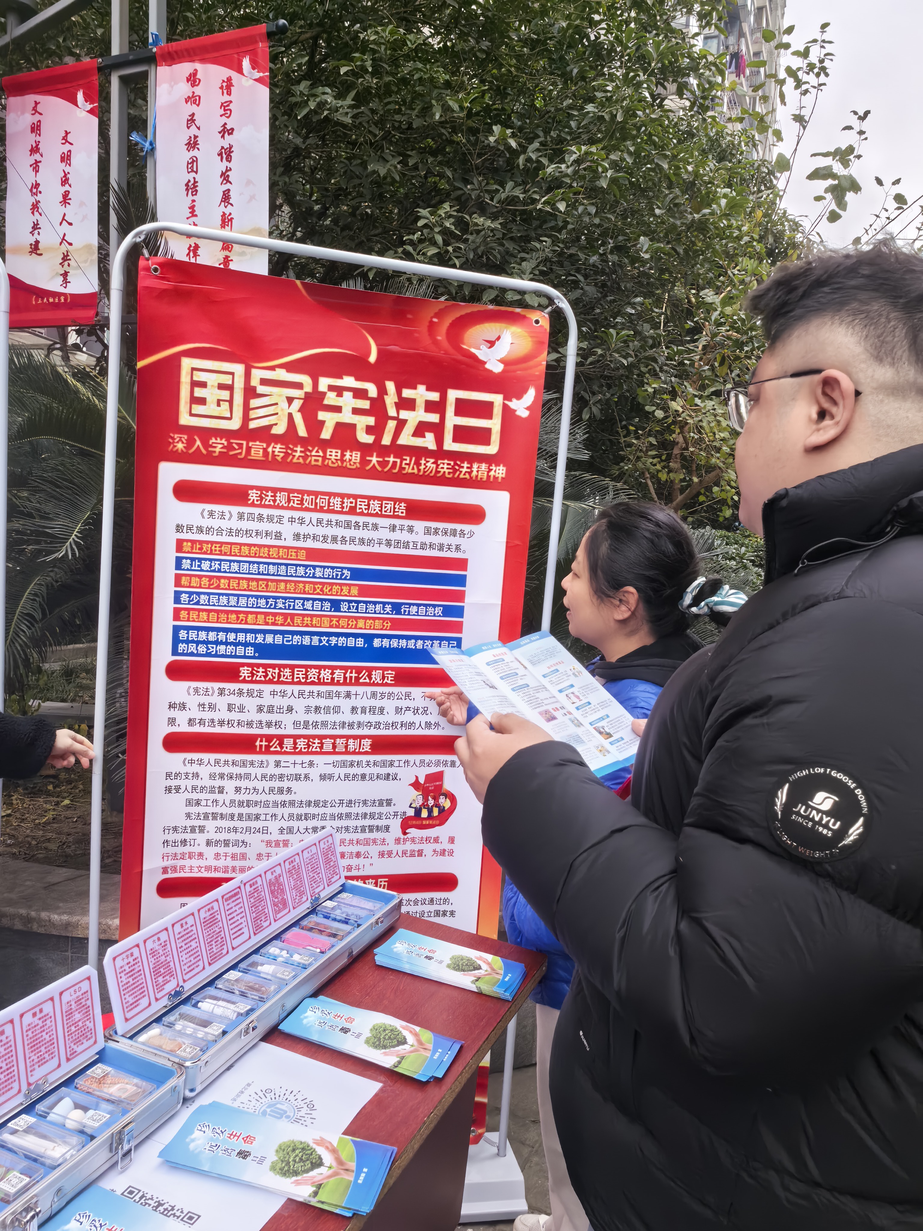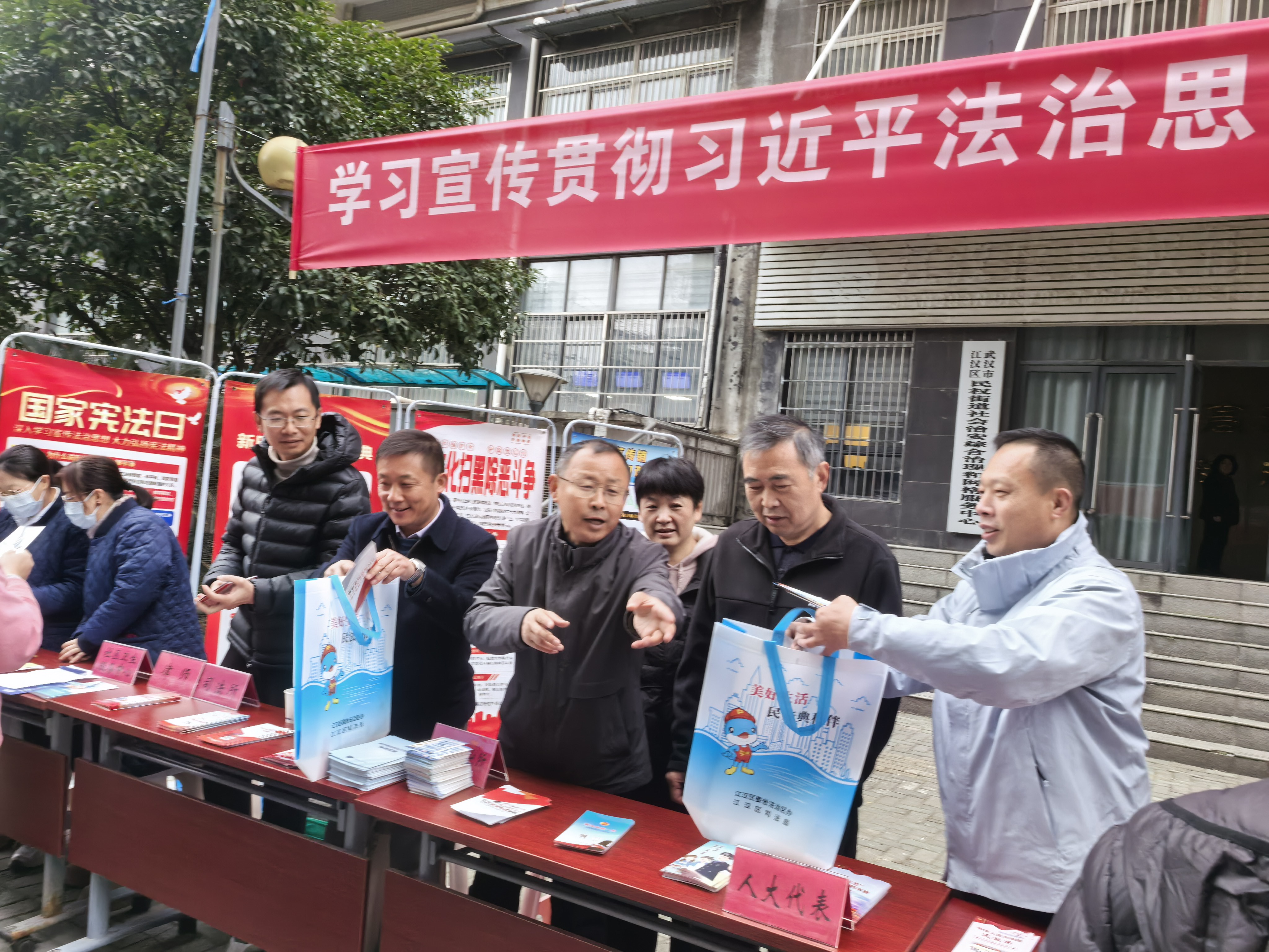 2025年12月4日上午9:30,第十二个"国家宪法日"如约而至。武汉市江汉区民权街道办事处在民权路152号广益天下B栋一楼政务中心门前,以"学习宣传贯彻习近平法治思想,推动宪法深入人心"为主题,开展宪法宣传周活动,将专业法治服务与民生关怀送到居民身边。