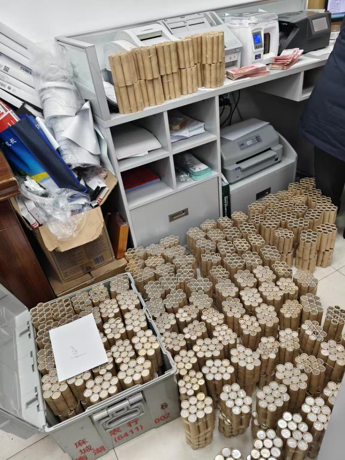 在接到客户大量硬币存款需求后,麻城农行南湖支行一方面主动对接麻城本地大型连锁超市及周边商户,提前协调硬币接收渠道;另一方面科学调配人力资源,开辟专属服务窗口,组建由内勤行长、柜面经理、大堂经理组成的专项服务团队。当日营业时间,工作人员面对堆积如山的成卷硬币,采用"分组清点+交叉复核"的标准化作业流程,通过手工清点方式逐卷逐箱完成核对登记,确保每枚硬币准确入账。