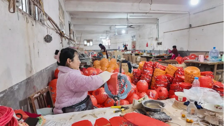 而在沙坪镇另一家以生产中式传统灯笼为主的崇阳中宇工艺股份有限公司生产车间内,工人们手持剪刀,动作娴熟地将彩纸剪成规整的形状,随后专注地将剪好的彩纸细致地糊在灯笼骨架上,一个个“喜事临门”“万事如意”等寓意吉祥的灯笼就制作完成了。“每天大概有30多名工人在紧锣密鼓地制作,日出货量在3000至4000只,产品主要销往北京、天津、义乌等地,市场反响非常好。”公司总经理何伟柱欣慰地说。