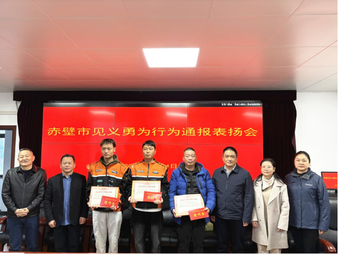 12月4日,赤壁市2025年第5场确认见义勇为行为通报表扬会在市委政法委召开,赤壁市委常委、市委政法委书记王辉将见义勇为行为确认证书郑重交到张继光、龚胜、王宇江手中。
