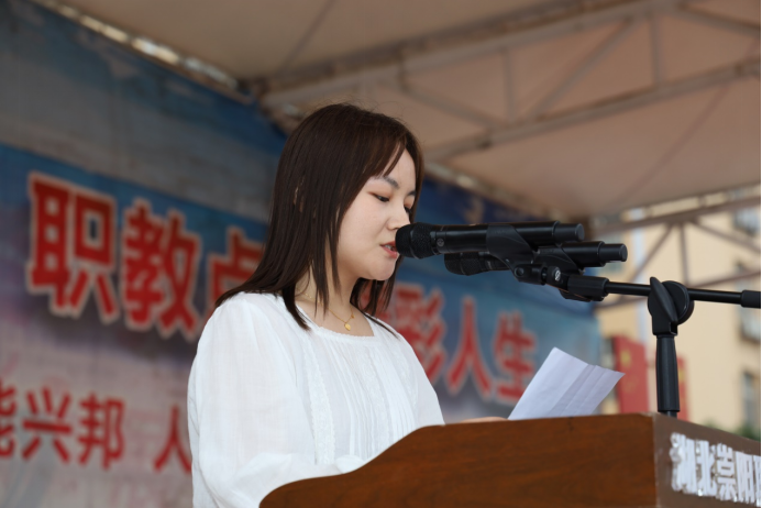 艺术教育部2024级园林1班的徐优雪作为学生代表,分享了她与队友在2025年世界职业院校技能大赛总决赛争夺赛林业赛道(中职组)中斩获国家级银奖的经历。她动情地讲述了备赛时的艰辛与团队协作的力量,将荣誉归功于学校、老师和队友。同时,她号召同学们在新学期明确目标、脚踏实地,在各自的赛道上奋力奔跑,创造属于自己的精彩。