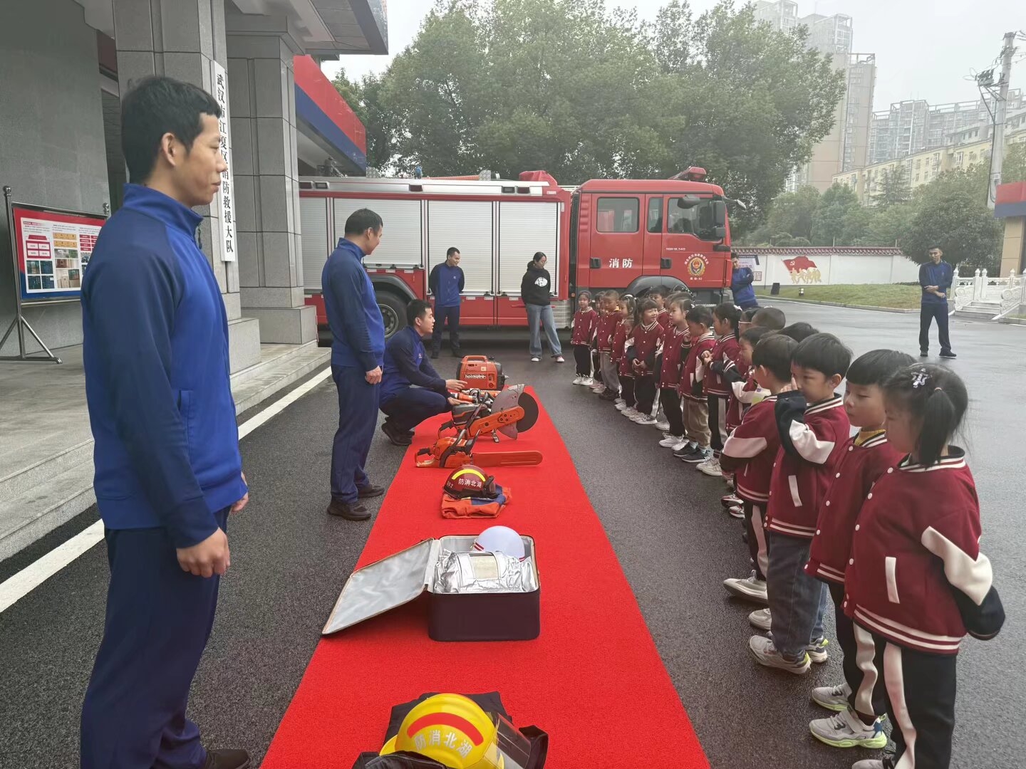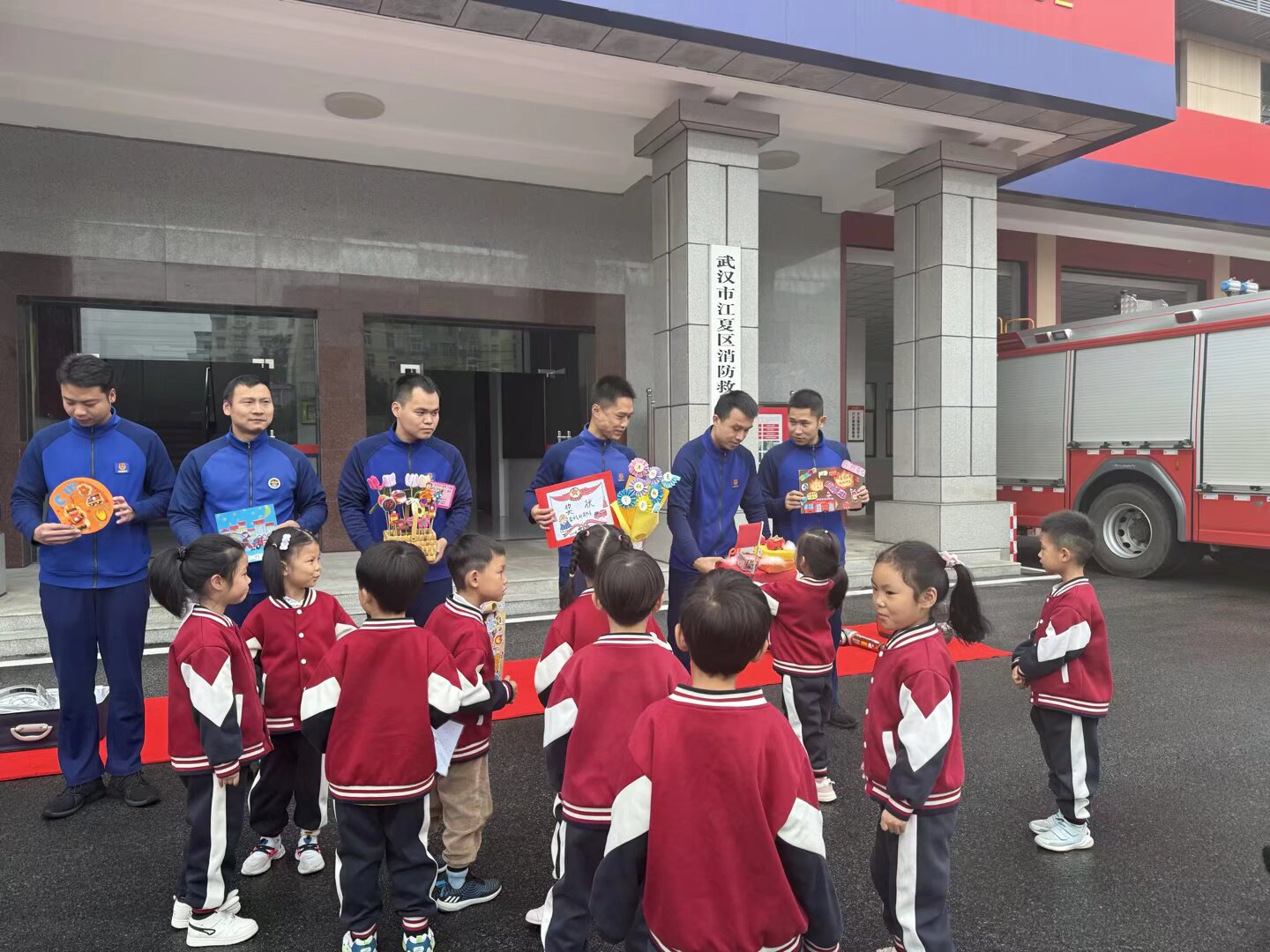 11月7日上午,中大班部分幼儿走进江夏区消防救援大队,参观消防车,试穿30斤重的战斗服,体验水枪。听到“消防员出警最快仅需45秒”时,孩子们自发鼓掌致敬。活动尾声,幼儿为消防员献上手工作品,约定“要做安全小宣传员”。
