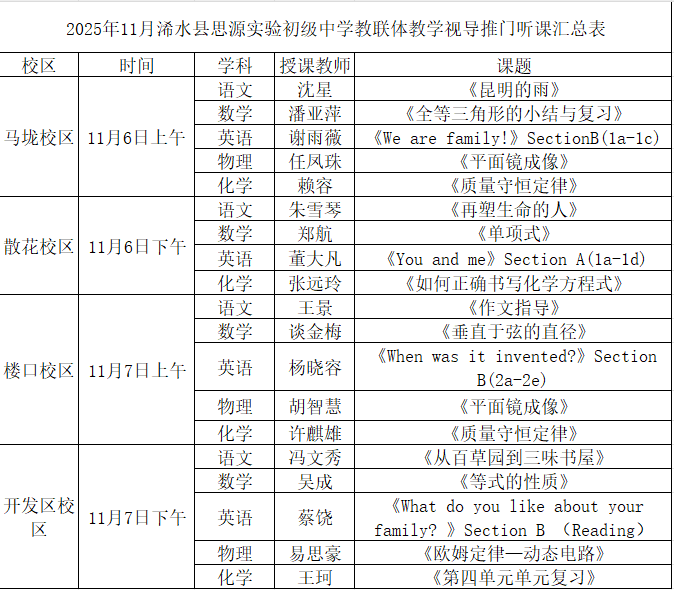 为贯彻落实新课改理念,深化课堂教学改革,促进教育教学质量全面提升,2025 年11月6日,浠水县教育科学研究院副院长周旺平及浠水县数学教研员毕俊、英语教研员陈慧敏、物理教研员邹咏、化学教研员王全云、罗旺明组成专业视导团队,到浠水县思源实验初级中学开展为期两天的集体教学视导。学校党委书记汪伟林、校长徐猛高度重视,携全体校委会成员以及各校区教研室成员、各学科教研组长全程参与,共探教学提质增效新路径。