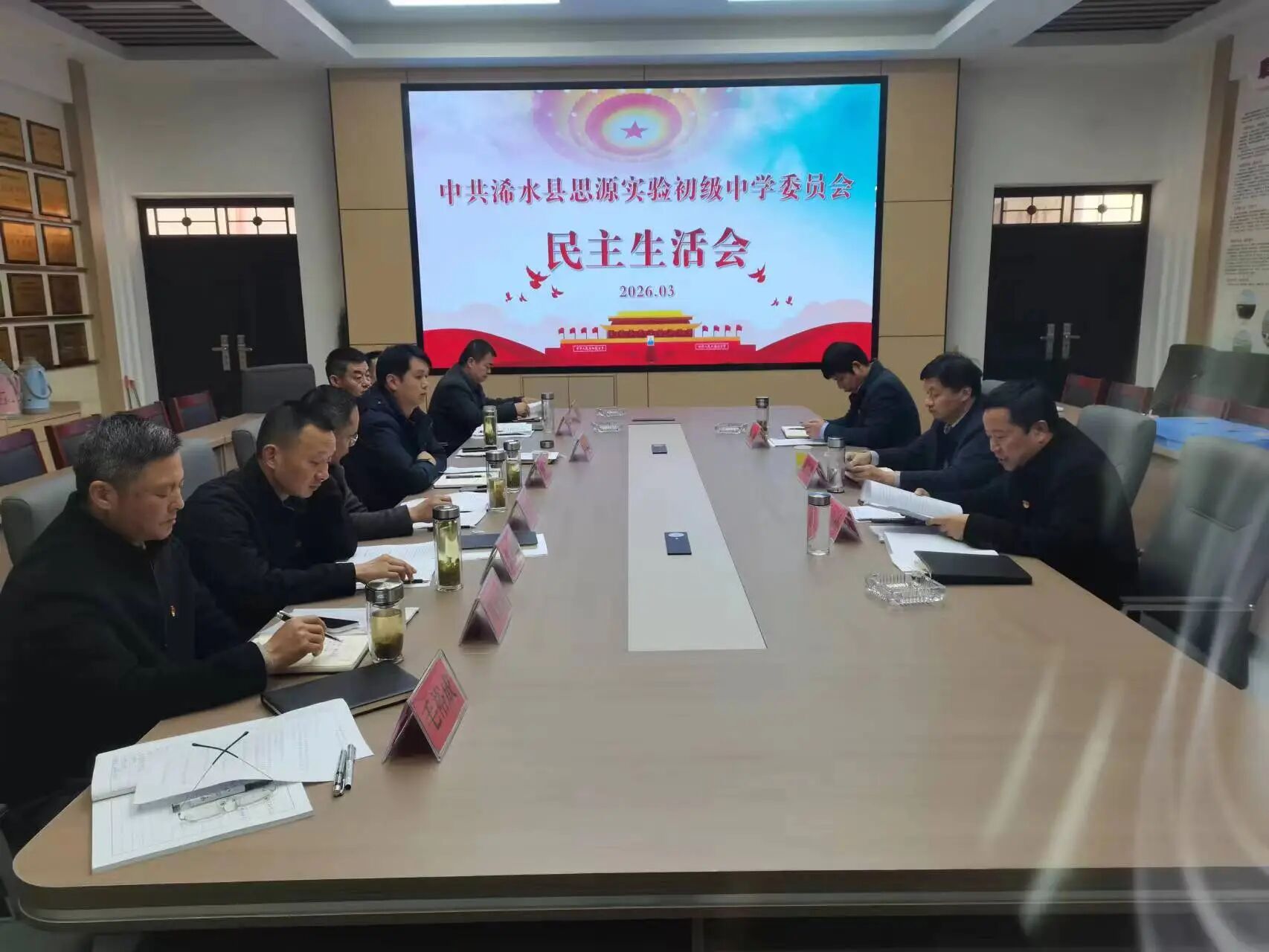 2026年3月19日,中共浠水县思源实验初级中学委员会2025年度民主生活会在学校一楼荣誉室召开。会议严格落实党中央及省委、市委、县委部署要求,紧扣会议主题开展批评与自我批评,切实达到统一思想、增进团结、改进工作、担当使命的效果。县教育局党办负责人翟春华同志到会指导,学校党委书记汪伟林同志主持会议,党委班子全体成员参加会议。