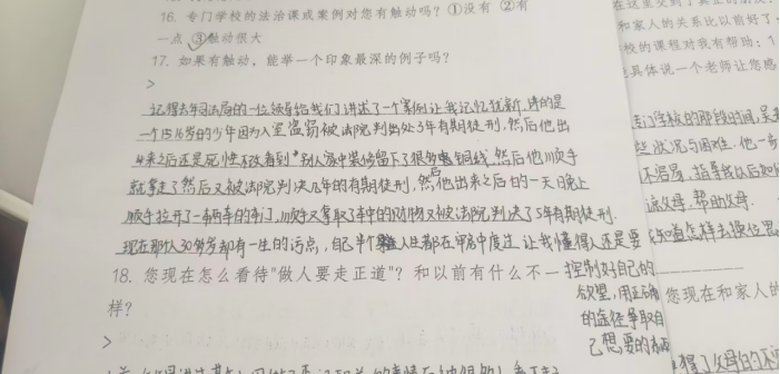 课后,多名学生把这个案例列为“印象最深”。“以前觉得偷点东西没什么,现在才知道一次次犯错会毁掉一辈子。”一名学生在调查问卷中这样写道。关于“做人要走正道”,孩子们的理解也从空洞变得具体--“控制欲望,用正确途径争取自己想要的东西。”