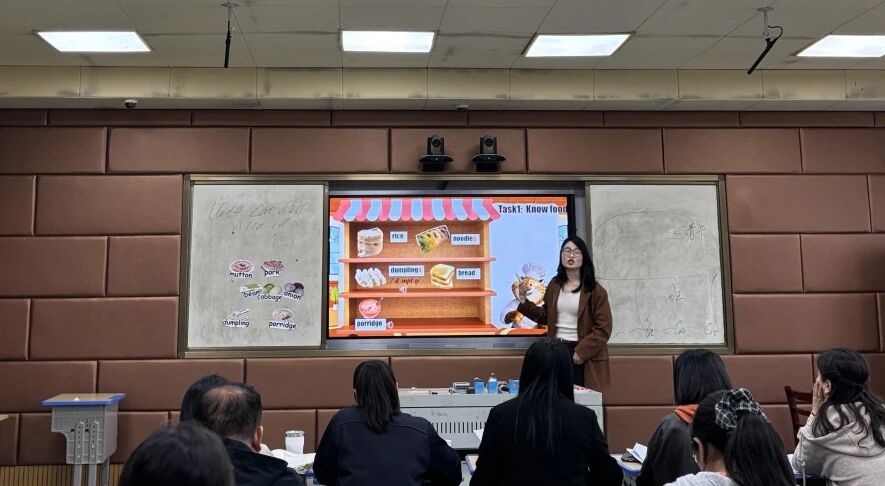 开发区校区蔡饶老师同课异构该单元,采用任务驱动法,以美食视频和单词游戏激活课堂,听前夯实词汇句型,听中分层抓取信息,听后以小组调查输出语言,并融入中西饮食文化对比,课堂活跃而扎实。