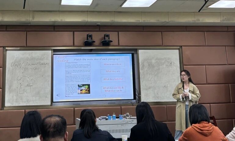 开发区校区刘丹老师带来七下 Unit 1 Section B 阅读课,以大象保护为切口,运用简笔画和视频激活背景,借助略读、扫读及思维导图梳理知识,读后小组讨论保护措施,将阅读训练与社会责任深度融合。