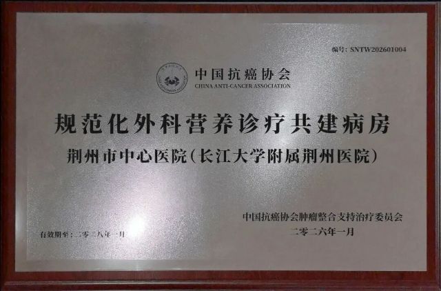近日,由中国抗癌协会肿瘤营养专业委员会主办的“规范化外科营养诊疗共建病房”项目2025年度评审结果揭晓,荆州市中心医院(长江大学附属荆州医院)胃肠外科成功获批国家级“规范化外科营养诊疗共建病房”。这是该科继“国家卫健委结直肠肿瘤外科标准化示范基地”之后取得的又一项国家级认证,标志着该院在围手术期营养管理及加速康复外科领域达到国家级水平。