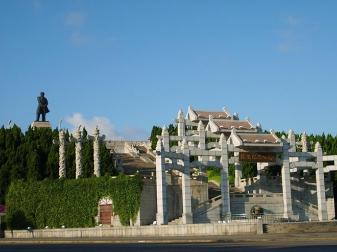 首先映入眼帘的是耸立在平台中央的"孙中山石像。"这座石像雕刻得栩栩如生、惟妙惟肖,好似拔地而起,又仿佛从天而落,整座石像堪称巧夺天工之作。而孙中山先生拄着拐杖,凝视远方。让人一睹了一代伟人的雄伟风姿,真是豪情壮志不减当年。