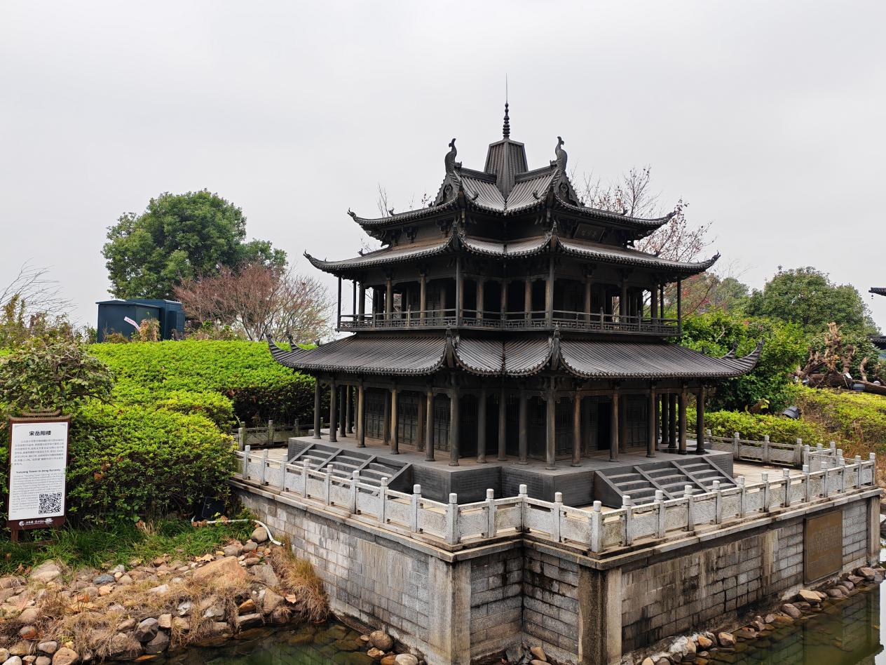 拾级而上,“五朝楼观”的青铜模型静静陈列,清晰勾勒出岳阳楼的演变轨迹,默默诉说着千年往事。这座楼宇的渊源可追溯至东汉建安年间,东吴名将鲁肃在此修筑阅军楼,操练洞庭水师以御外敌,此为岳阳楼之滥觞。唐代时,它因地处郡署之南被称作“南楼”,张说、李白等诗人登临题咏,“岳阳楼”之名方才流传至今。真正让它名垂千古的,是北宋庆历六年的重修,被贬巴陵郡的滕子京“增其旧制”,后邀范仲淹作记。范文正公虽未亲至,仅凭一纸《洞庭秋晚图》与书信,便挥毫写下“先天下之忧而忧,后天下之乐而乐”的千古绝唱,让这座楼阁从此超越了建筑本身,成为承载家国情怀的精神地标。