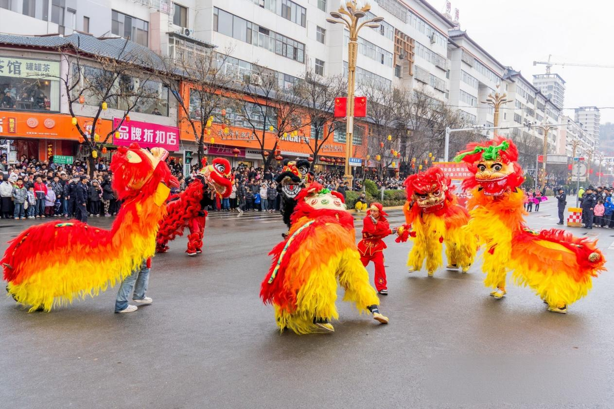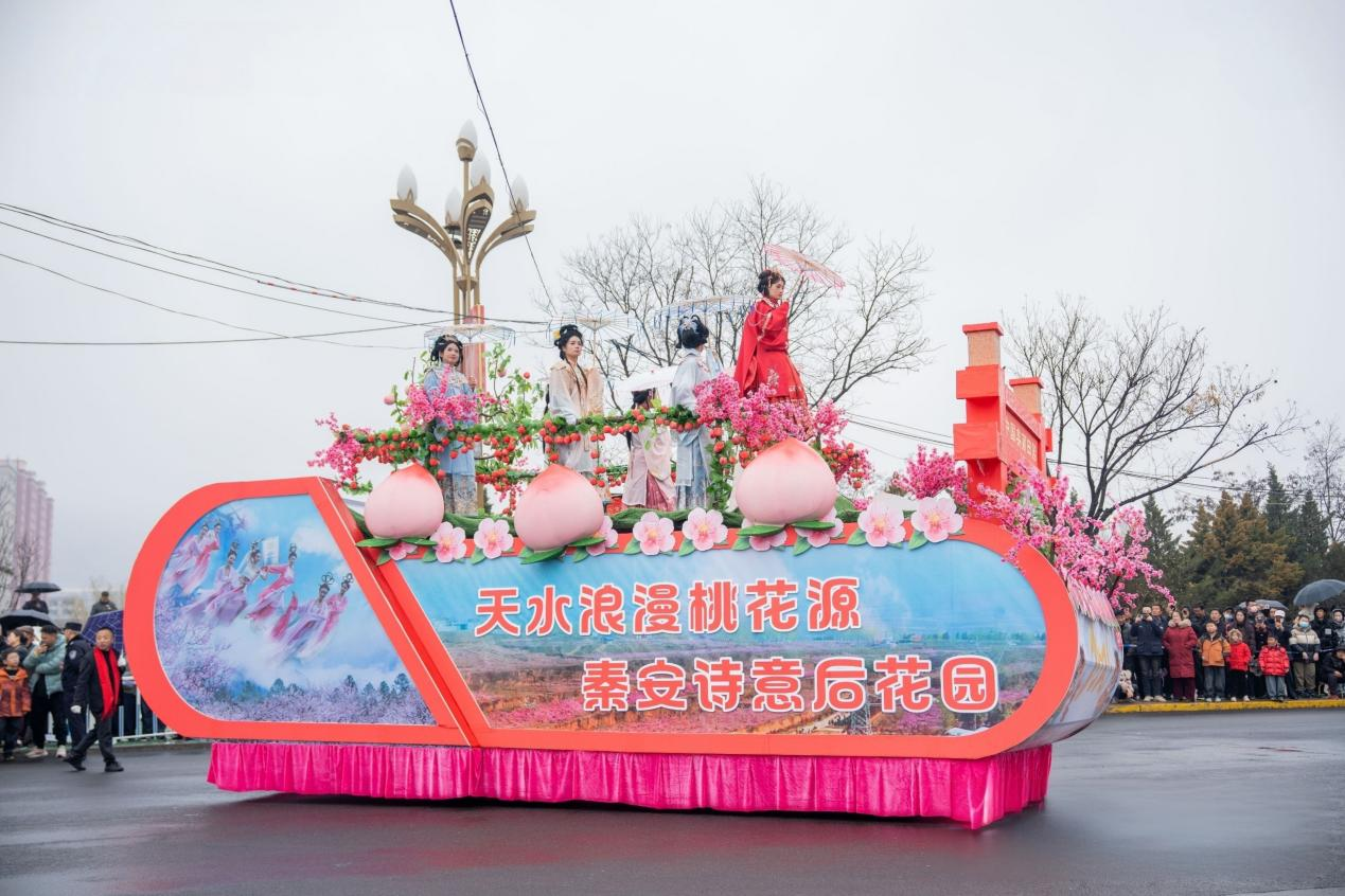 正月十三全县社火汇演,各乡镇的社火队伍成了县城里最亮眼的风景。统一身着彩衣,走得整整齐齐,蜡花舞的姑娘们舞步轻盈,彩车上画着大地湾遗址、万亩桃花源,把秦安的烟火气和新变化,都展现在全县人民面前。