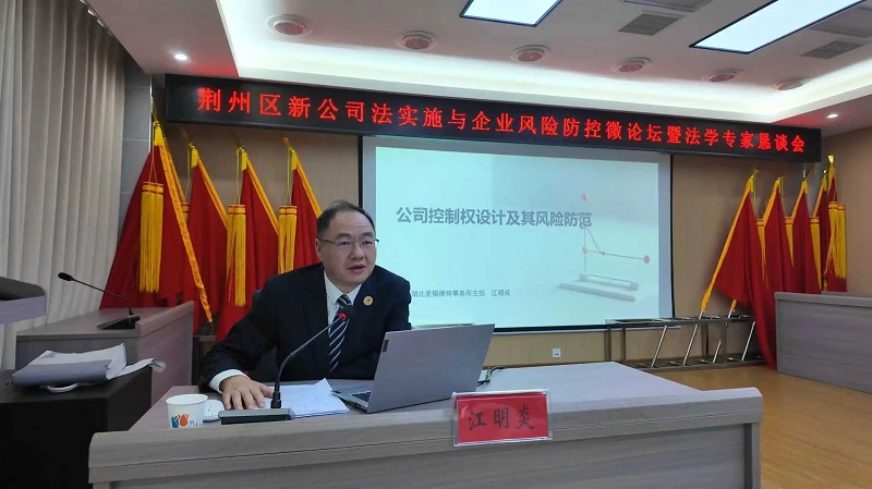 荆州区法学会邀请荆州市法学会副会长、湖北旻韬律师事务所主任江明炎和会计学堂荆州分校校长伍艳娥分别围绕《公司控权设计及风险防控》、涉企税收政策作专题报告。与会企业负责人与法学专家围绕股权结构、内部治理、劳动用工、工伤事故处理等问题积极互动,在答疑解惑中进一步强化了企业负责人的法治意识。