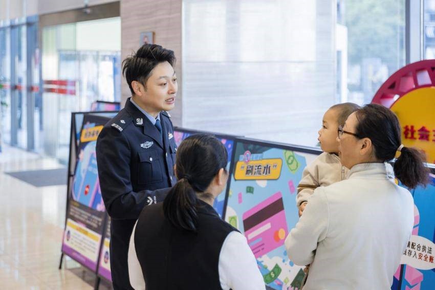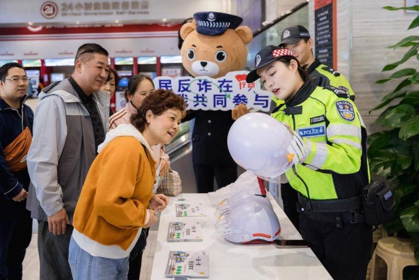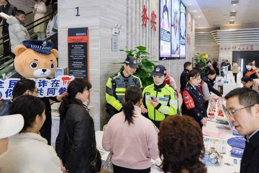 不远处,刑侦大队民警带着“反诈小熊”发放宣传单,还开展知识问答,拿到小礼品的李女士恍然大悟:“原来所谓的‘安全账户’全是骗局,我这就给家里人打电话提醒!”